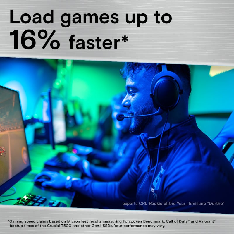 The Crucial T500 PCIe® Gen4 NVMe SSD will improve your gaming and content creation experience. The T500 is a game changer, designed for high-performance gaming, PS5 upgrades, and photo/video editing. With sequential read/write speeds of up to 7,200/5,700MB/s and random read/write speeds of up to 1.39M IOPs, you'll be able to load games 16% faster and enjoy a 42% increase in content creation app performance.